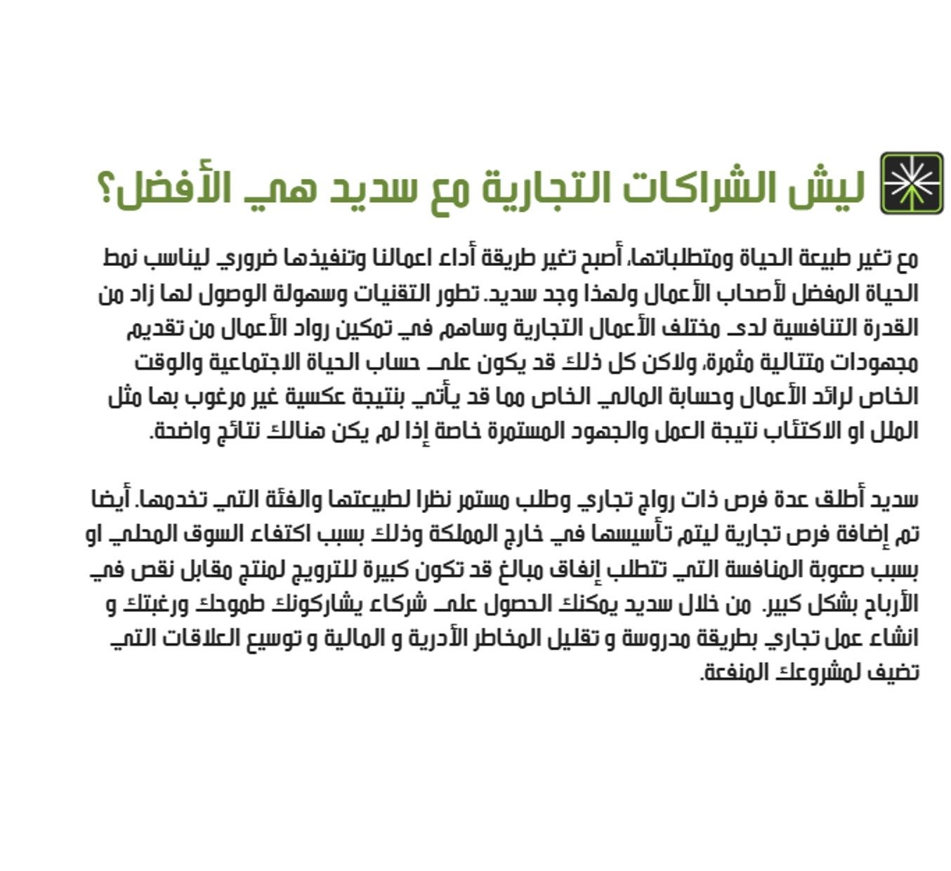 بناء الشراكات التجارية بطريقة صحية و عادلة قد تكون مليئة بالتحديات اضافه لذلك الشركاء التجاريين الجادين و الذين يعتبرون إضافة جيدة غير متوفرين بكثرة و سهولة. سديد ادركت هاذي الفجوة ولذلك قامت بإنشاء هاذي المنصة لتسهيل وصول الشركاء مع بعض من خلال الفرص المطروحة للشراكة.